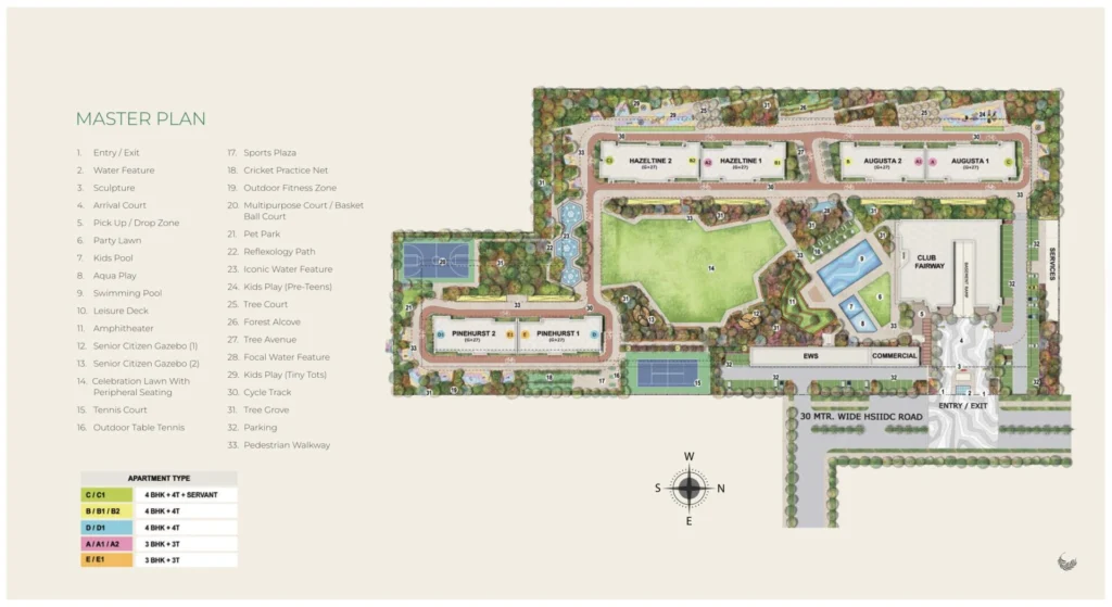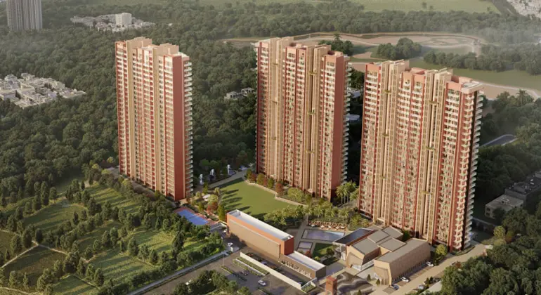 - Serene Forest & Golf-Course Vistas with Zero Surface Traffic: All towers overlook the lush Aravallis, a nearby golf course, or internal parklands. Ground-level vehicle parking is shifted underground, enhancing pedestrian safety and preserving the serene environment above